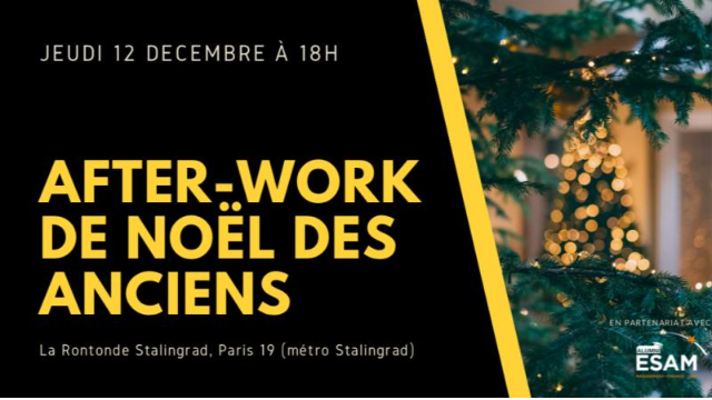 Chères diplômées, chers diplômés de l'ESAM, Les étudiants du Bachelor vous convie à l'After Work de Noël le jeudi 12 décembre 2019. La soirée se déroulera à La Rotonde Stalingrad à partir de 18h00.Venez nombreux !
