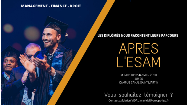 Chères diplômées, chers diplômés,Conférence "Après l'ESAM" - 22 janvier 2020 à 18hLes actuels étudiants du Cycle Bachelor de l'ESAM recherchent plusieurs diplômé.es pour témoigner de leurs parcours et les accompagner dans leurs projets professionnels.Si vous souhaitez participer, n'hésitez pas à me contacter ! Au plaisir,